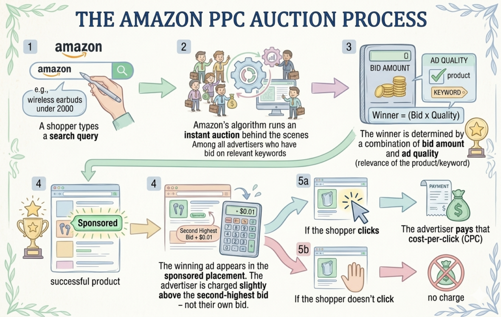 PPC-driven sales count identically to organic sales in Amazon’s algorithm. Every order generated by a Sponsored Products ad contributes to your product’s sales velocity, which improves your organic search rank, which generates more organic sales, which improves your BSR, which generates more clicks at zero ad cost.